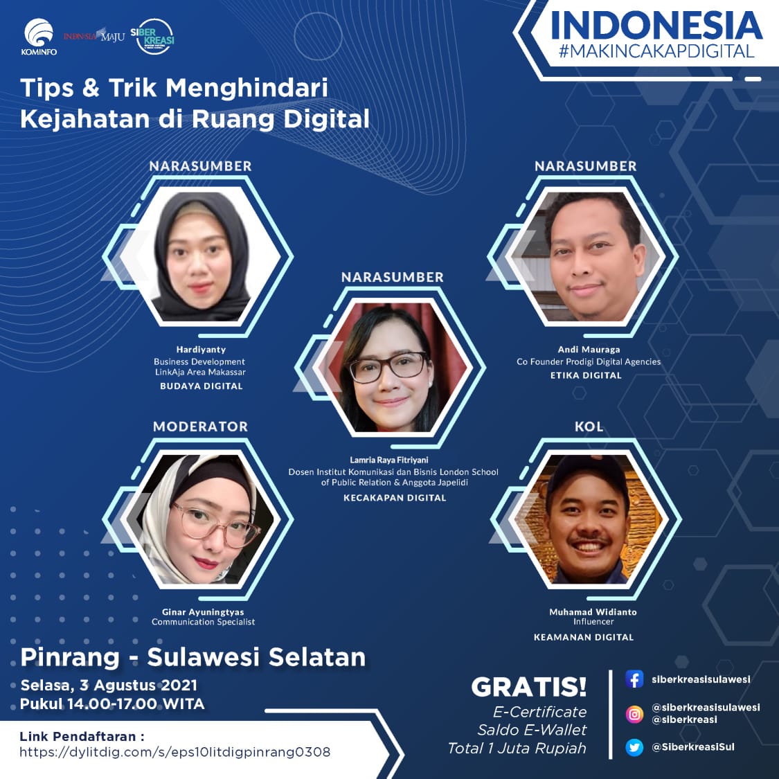 Kolaborasi ketiga lembaga ini dikhususkan pada penyelenggaraan Program Literasi Digital di wilayah Sulawesi. Adapun tema kali ini adalah “Tips dan Trik Menghindari Kejahatan di Ruang Digital”.