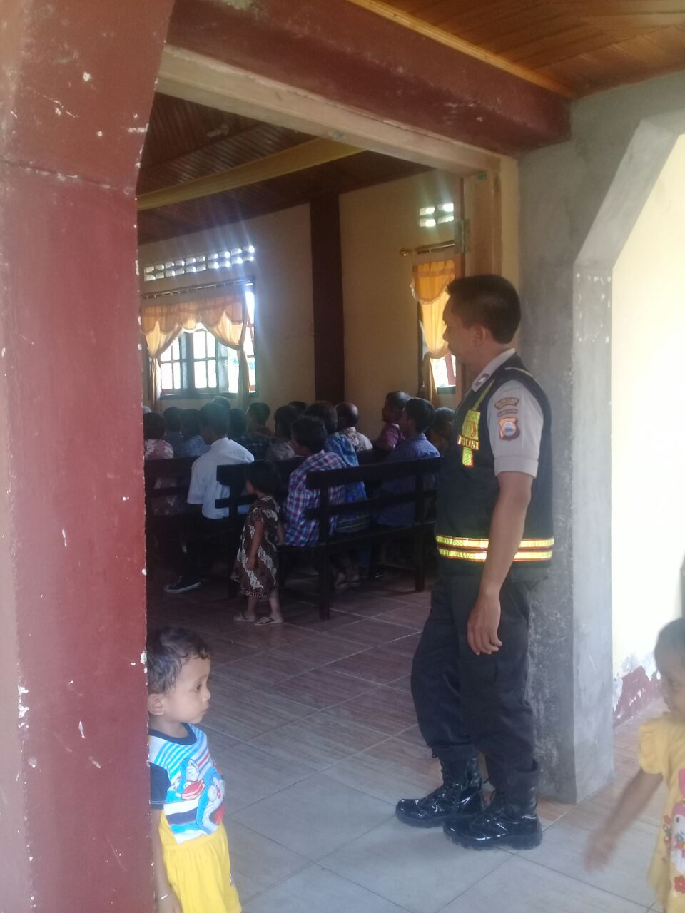 Koma.co.id, Luwu Utara —- Bhabinkamtibmas Polsek Sukamaju Polres Luwu Utara, Brigadir Igp Wirabuana, melakukan pengamanan di Gereja Jemaat Salubungin di desa Tolangi, kecamatan Sukamaju, Minggu 27 Mei 2018.