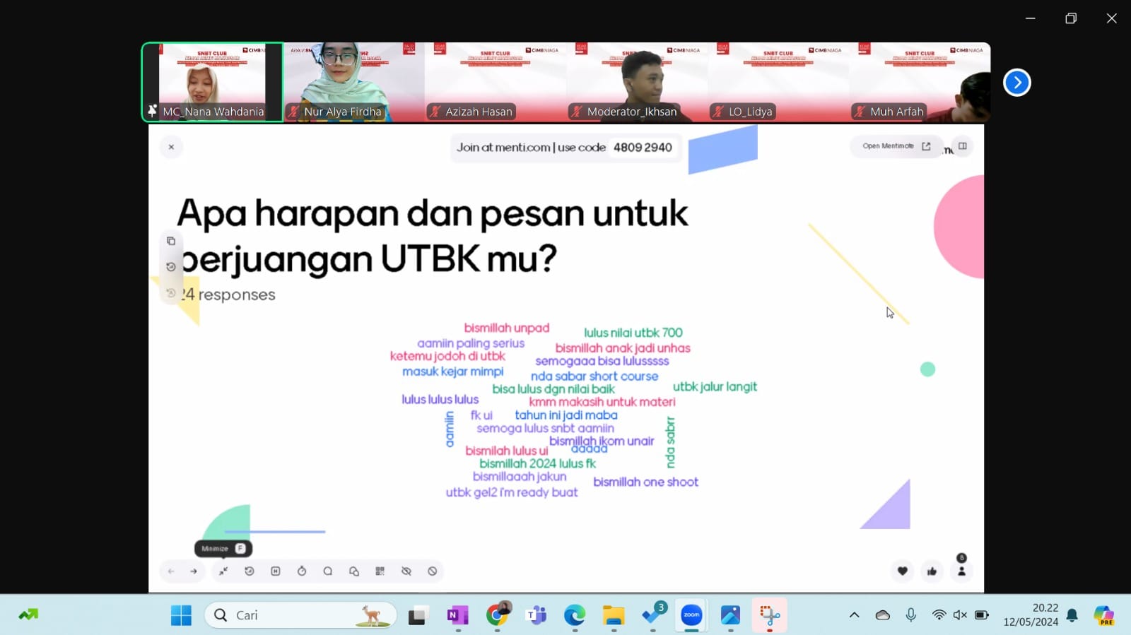 Koma.co.id, Makassar– SNBT Club yang diinisiasi oleh CIMB Niaga kembali memberi motivasi kepada calon mahasiswa baru. Melalui meeting zoom, sejumlah peserta mengikuti kegiatan yang telah dirangkaikan pada Minggu, 12 Mei 2024.