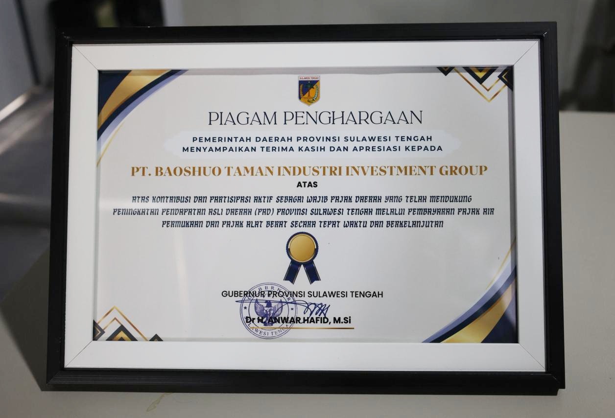 Koma.co.id, Morowali– PT Baoshuo Taman Industry Investment Group (BTIIG) atau Huabao Indonesia pada HUT Provinsi Sulawesi Tengah yang ke 62 berhasil menerima penghargaan atas kontribusi sebagai wajib pajak yang telah berkontribusi pada peningkatan pendapatan asli daerah (PAD) Sulteng melalui pembayaran pajak air permukaan dan alat berat secara tepat waktu dan berkelanjutan.