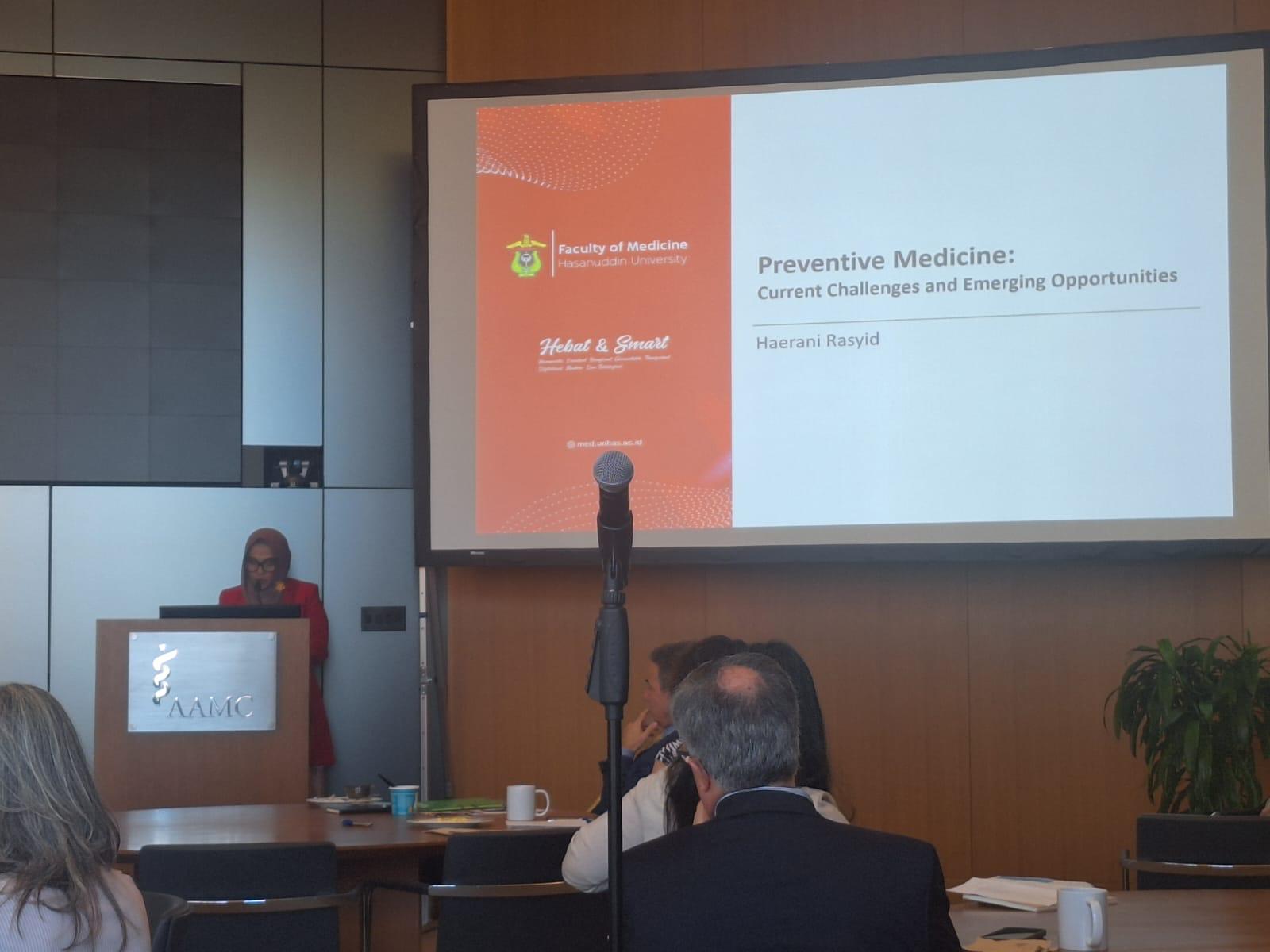 Prof. Haerani menjadi pembicara dalam panel yang berjudul “Preventive Medicine: Tantangan Saat Ini dan Peluang yang Muncul”. Pada kesempatan ini Prof. Haerani tidak hanya menjelaskan tantangan masa kini dan masa depan untuk kedokteran preventif, tetapi juga memaparkan upaya yang telah dilakukan oleh FK Unhas dalam pendidikan mereka untuk mendukung kedokteran preventif.
