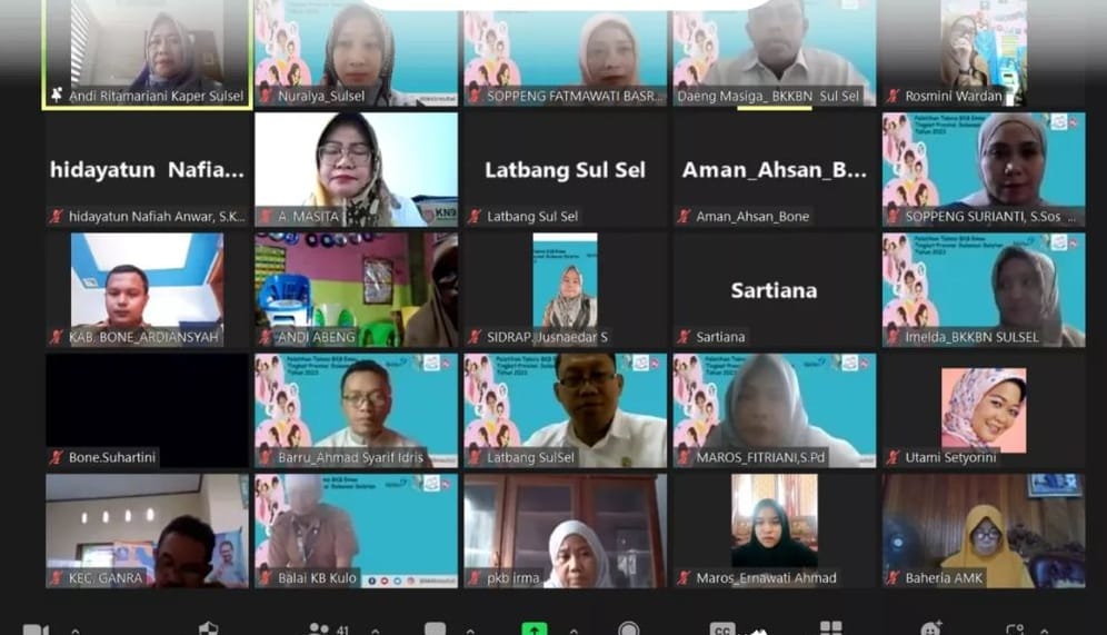 Kegiatan Pelatihan BKB Emas ini dilakasanakan secara Virtual dan berlangsung selama 5 hari mulai tanggal 12 s/d 16 Juni 2023. Diikuti oleh 40 orang peserta yang terdiri dari unsur OPD KB, PKB/PLKB dan Kader BKB dari delapan Kab/Kota yaitu, Kabupaten Barru, Bone, Wajo, Soppeng, Sidrap, Pangkep, Maros dan Kota Pare-Pare.