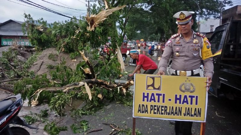 Kasat Lantas, AKP Mustari. bersama anggotanya segera bertindak mengatur lalu lintas dan memangkas pohon tumbang tersebut.