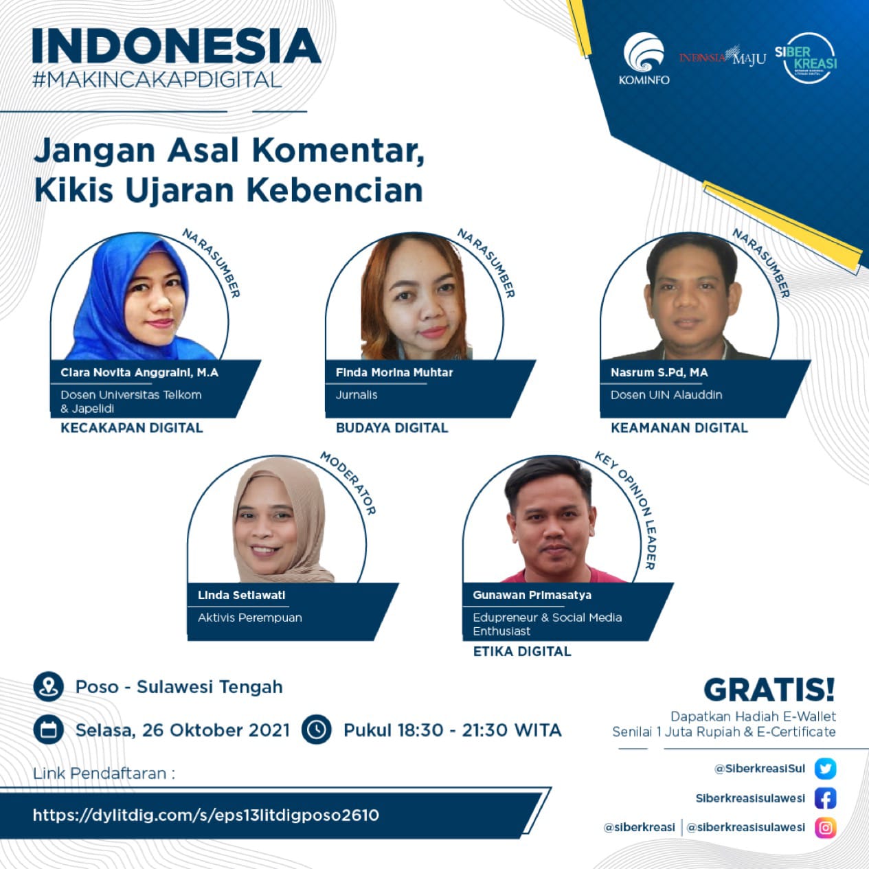 Koma.co.id, Poso– Rangkaian Program Literasi Digital “Indonesia Makin Cakap Digital” di Sulawesi, yang diselenggarakan oleh Kementerian Komunikasi dan Informatika Republik Indonesia dan Siberkreasi bersama Dyandra Promosindo, kali ini dilaksanakan secara virtual di Poso, Sulawesi Tengah pada 26 Oktober 2021. Kolaborasi ketiga lembaga ini dikhususkan pada penyelenggaraan Program Literasi Digital di wilayah Sulawesi. Adapun tema kali ini adalah “Jangan Asal Komentar, Kikis Ujaran Kebencian”.