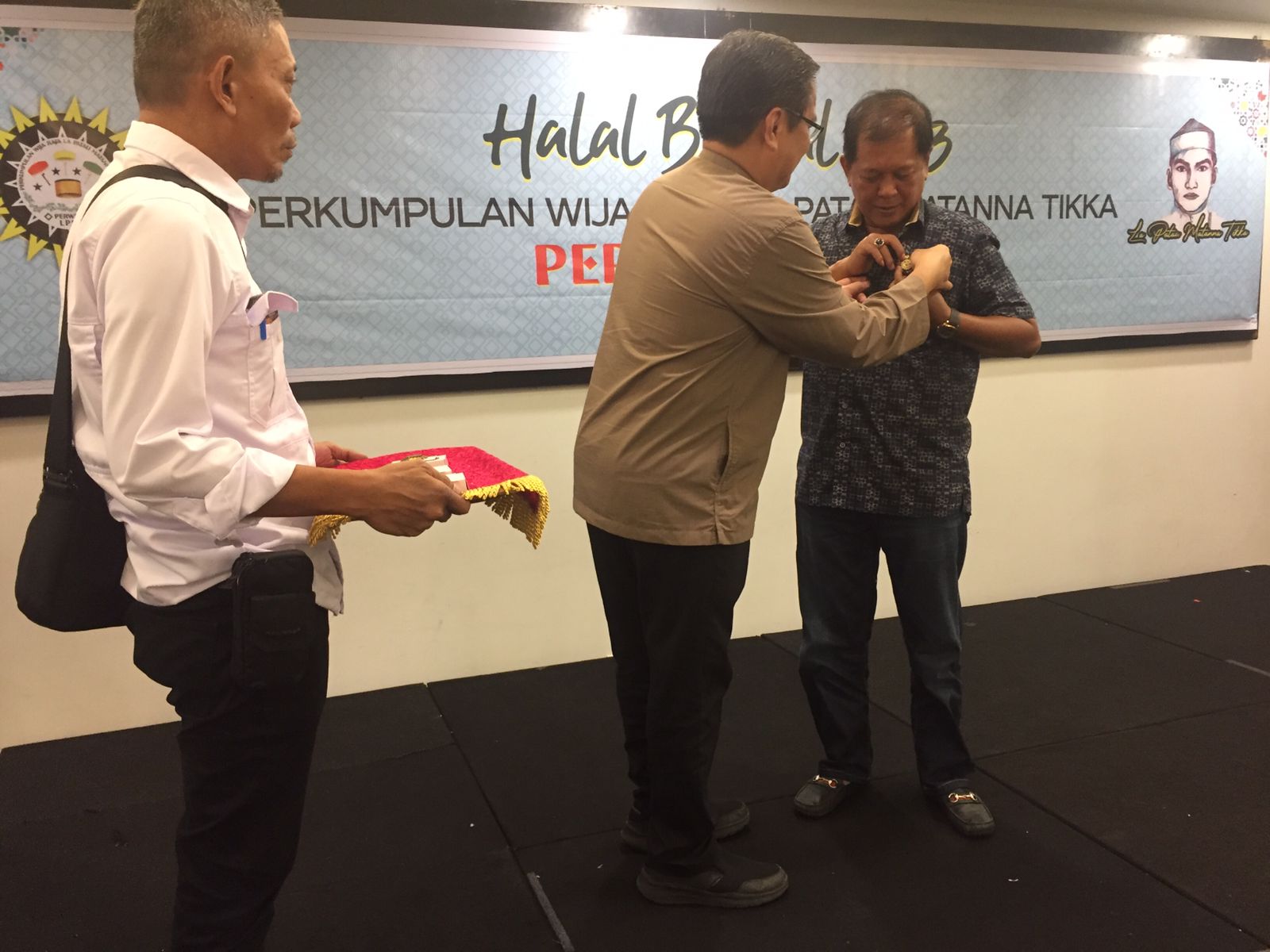 Sementara ketum Periwra Andi Sapri Pamulu mengucapkan terima kasih atas waktu menghadiri halal bihalal ini. Ketua Umum Periwra menyematkan pin Lapatau kepada Bupati Soppeng.