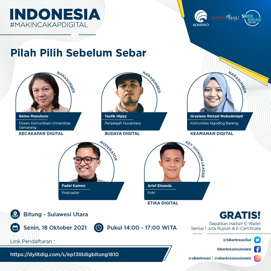 Sedangkan moderator yaitu Fadel Karnen. Rangkaian Program Literasi Digital “Indonesia Makin Cakap Digital” di Sulawesi menargetkan 57.550 orang peserta.