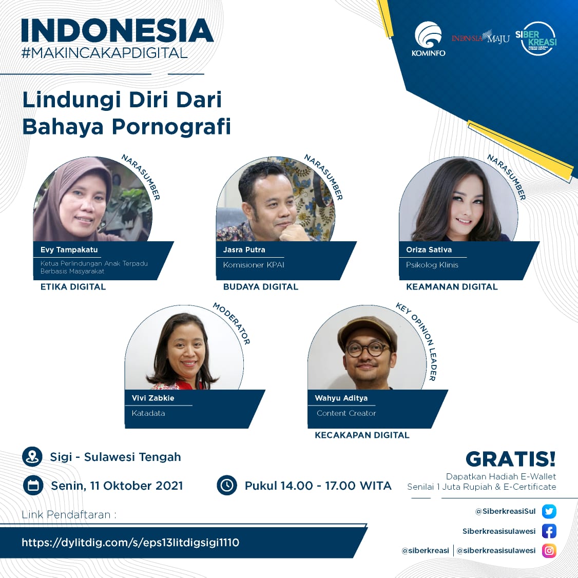 Program kali ini menghadirkan empat narasumber yang terdiri dari kreator konten, Wahyu Aditya; Ketua Perlindungan Anak Terpadu Berbasis Masyarakat, Evy Tampakatu; Komisioner KPAI, Jasra Putra; dan psikolog klinis, Oriza Sativa. Adapun sebagai moderator adalah Vivie Zabkie. Sebanyak 620 peserta dari berbagai kalangan mendaftarkan dirinya untuk mengikuti kegiatan webinar kali ini. Rangkaian Program Literasi Digital “Indonesia Makin Cakap Digital” di Sulawesi menargetkan 57.550 orang peserta.