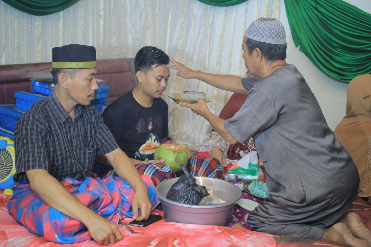 Haji Ida kembali memulai dengan membaca doa sambil memegang batang berbagai jenis daun-daunan dan mencelupkan ke dalam baskom lalu menepuk-nepuk tengkuk Raehan sebanyak dua kali, kemudian di sebelah kanan-kiri dan terakhir kepala. Ritual dilakukan bergantian yang dimulai dari Haji Ida, kedua orangtua, kemudian kerabat keluarga sampai si calon pengantin pria basah seperti sedang dimandikan dengan daun.