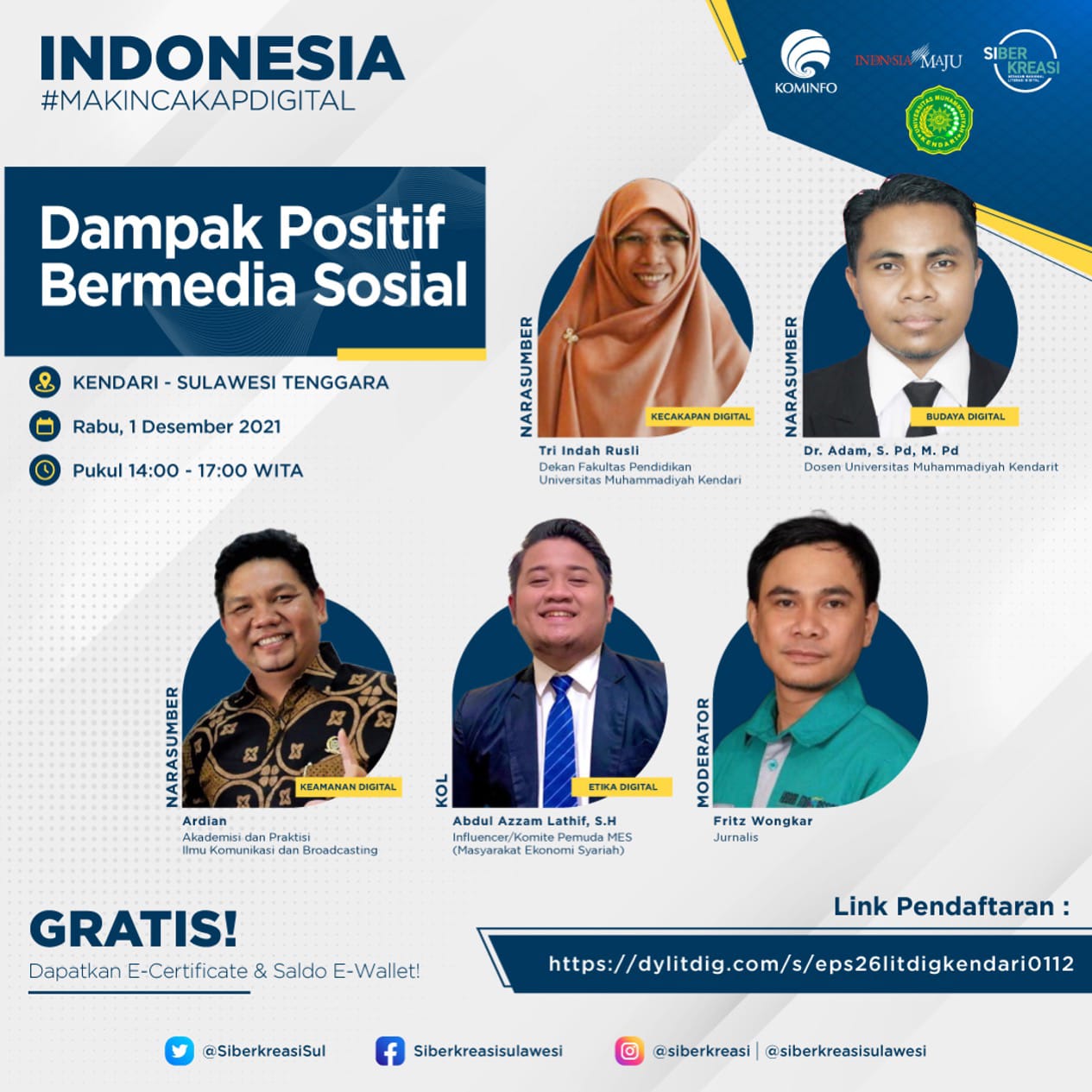 Koma.co.id, Kendari– Rangkaian Program Literasi Digital “Indonesia Makin Cakap Digital” di Sulawesi, yang diselenggarakan oleh Kementerian Komunikasi dan Informatika Republik Indonesia dan Siberkreasi bersama Dyandra Promosindo, dilaksanakan secara virtual pada 1 Desember 2021 di Kendari, Sulawesi Tenggara. Kolaborasi ketiga lembaga ini dikhususkan pada penyelenggaraan Program Literasi Digital di wilayah Sulawesi. Tema yang diusung pada hari ini yaitu “Dampak Positif Bermedia Sosial”. Kegiatan webinar kali ini merupakan bentuk kerjasama dengan Universitas Muhammadiyah Kendari dan STIE Kendari.