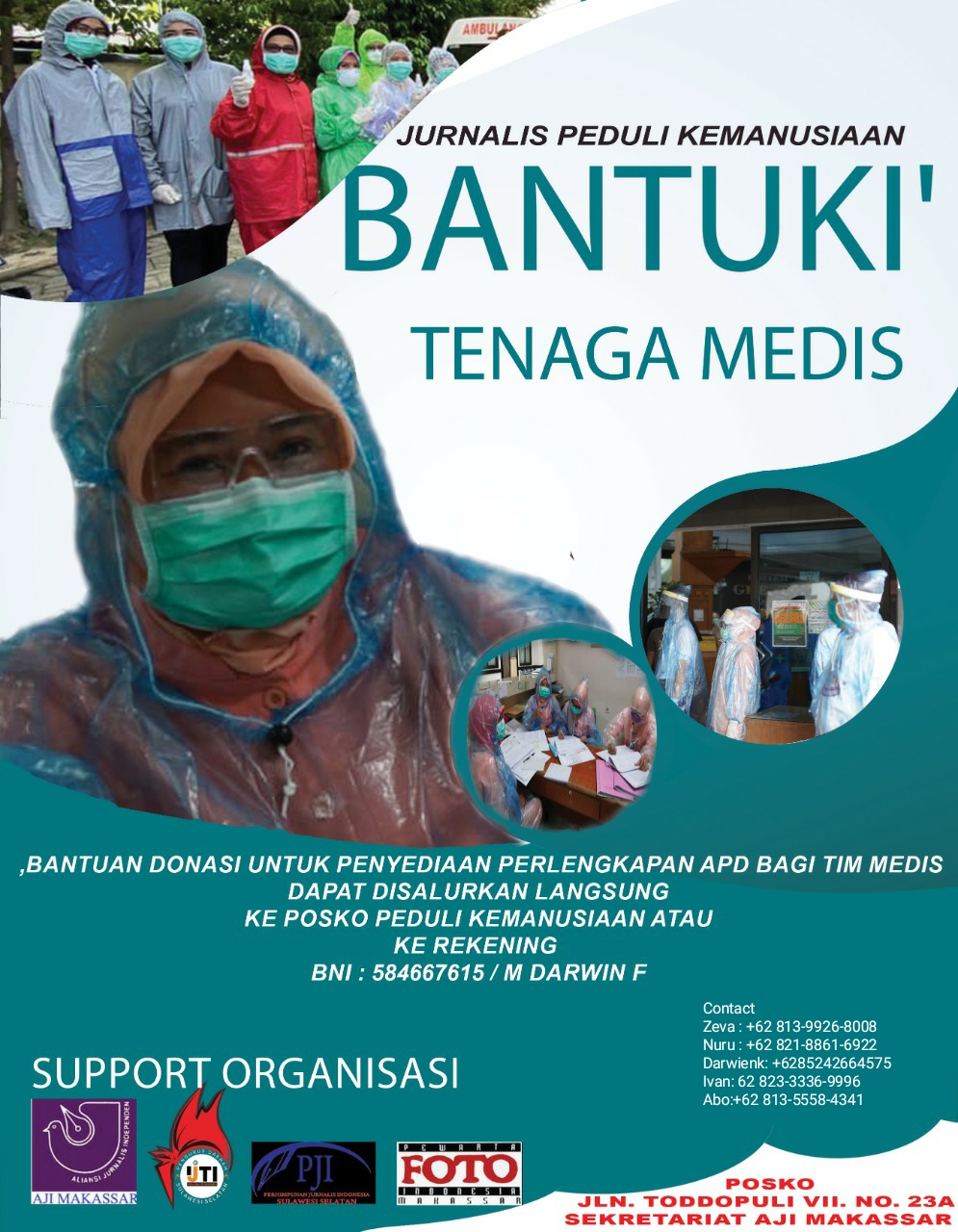 Untuk posko Jurnalis Peduli Kemanusiaan di Sekretariat AJI Makassar jalan Toddopuli VII nomor 23 A Makassar. Sedangkan donasi ikut berbagi, bisa melalui rekening BNI Makassar, an. M Darwin F di nomor rekening 584667615. Sekecil apapun bantuan Anda, tentu akan sangat bermanfaat bagi para tenaga medis.