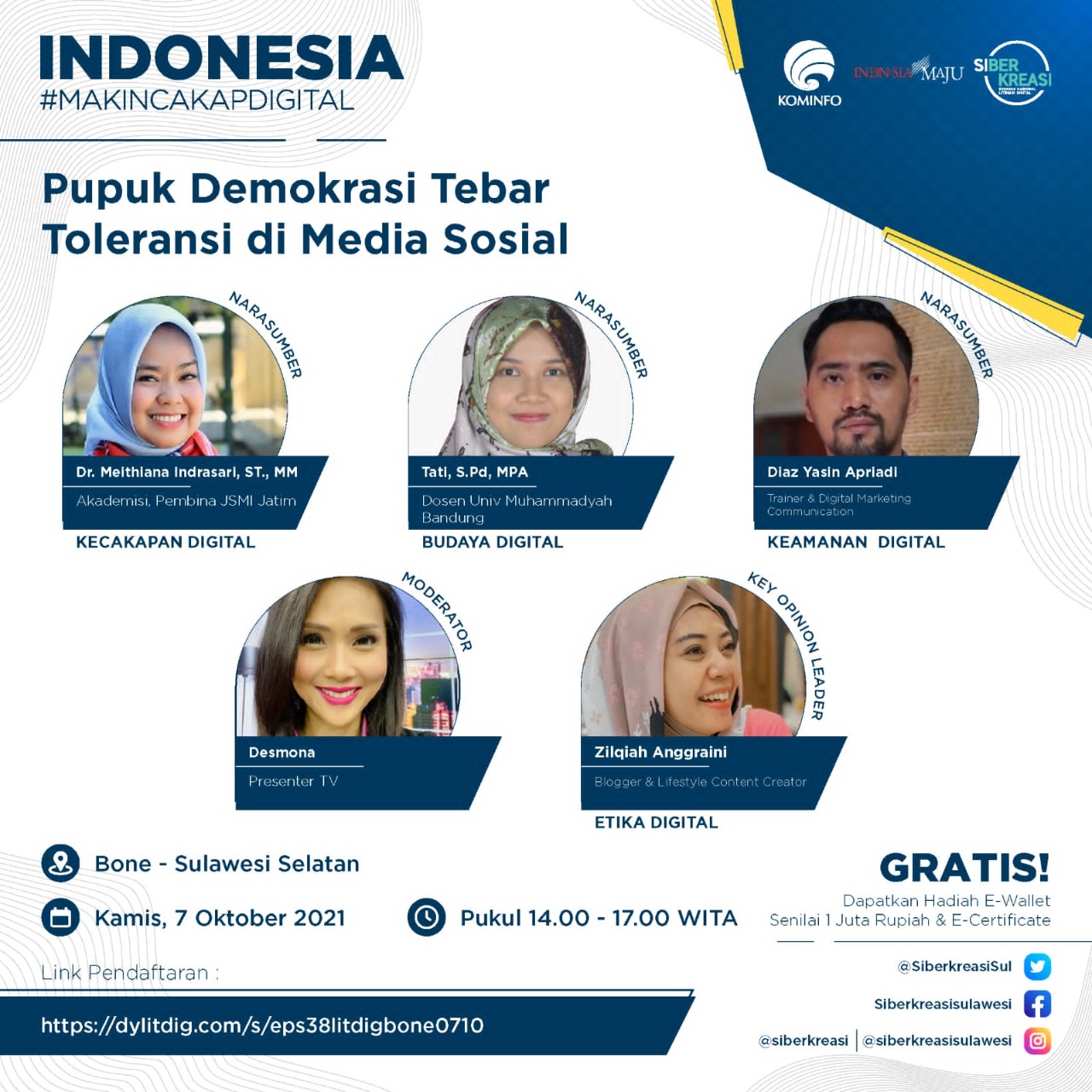 Koma.co.id, Bone– Rangkaian Program Literasi Digital “Indonesia Makin Cakap Digital” di Sulawesi, yang diselenggarakan oleh Kementerian Komunikasi dan Informatika Republik Indonesia dan Siberkreasi bersama Dyandra Promosindo, dilaksanakan secara virtual pada 7 Oktober 2021 di Bone, Sulawesi Selatan. Kolaborasi ketiga lembaga ini dikhususkan pada penyelenggaraan Program Literasi Digital di wilayah Sulawesi. Kegiatan dengan tema “Pupuk Demokrasi Tebar Toleransi di Media Sosial” ini diikuti oleh 639 peserta dari berbagai kalangan.