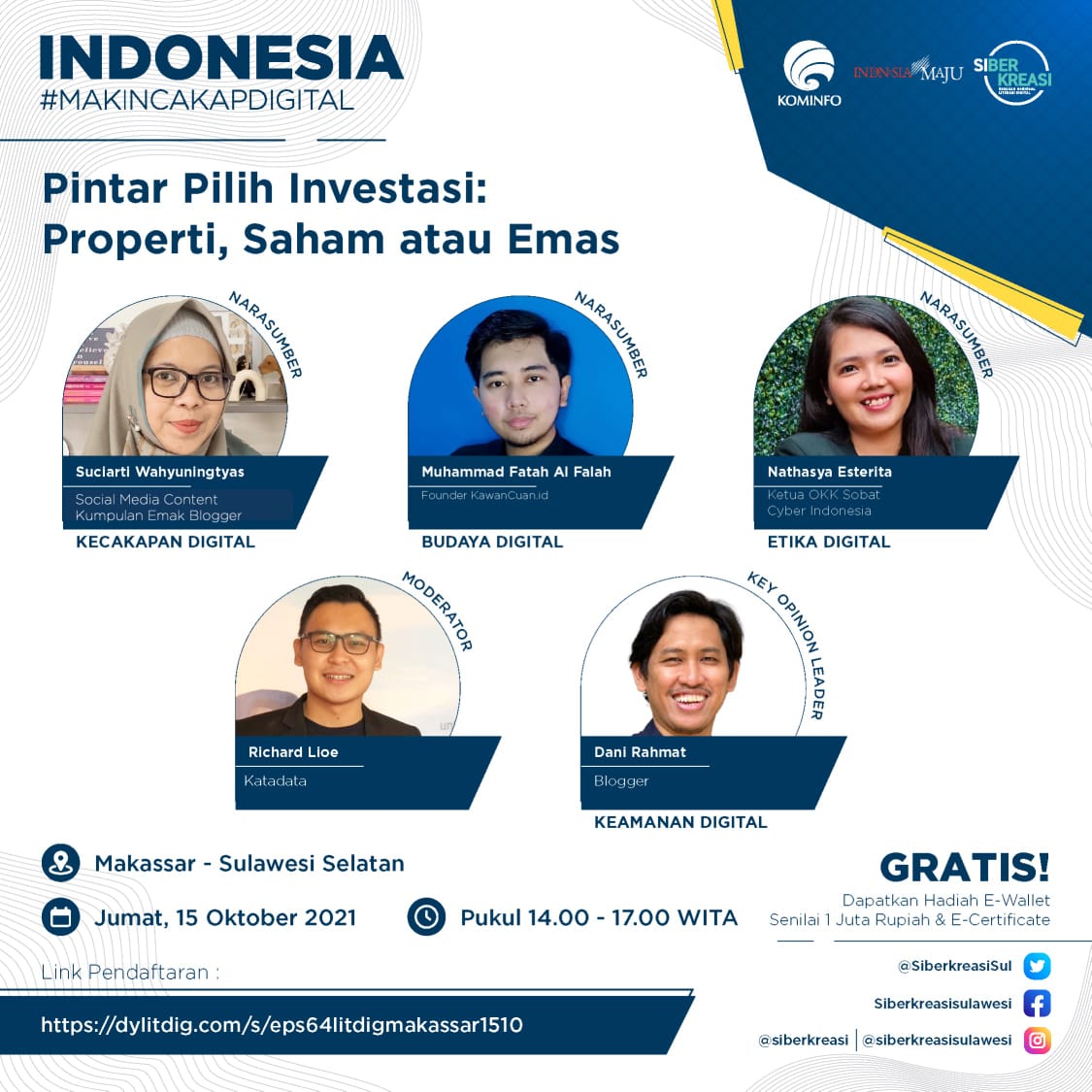 Koma.co.id, Makassar– Rangkaian Program Literasi Digital “Indonesia Makin Cakap Digital” di Sulawesi, yang diselenggarakan oleh Kementerian Komunikasi dan Informatika Republik Indonesia dan Siberkreasi bersama Dyandra Promosindo, dilaksanakan secara virtual pada 15 Oktober 2021 di Makassar, Sulawesi Selatan. Kolaborasi ketiga lembaga ini dikhususkan pada penyelenggaraan Program Literasi Digital di wilayah Sulawesi. Adapun tema kali ini adalah “Pintar Pilih Investasi: Properti, Saham, atau Emas”.