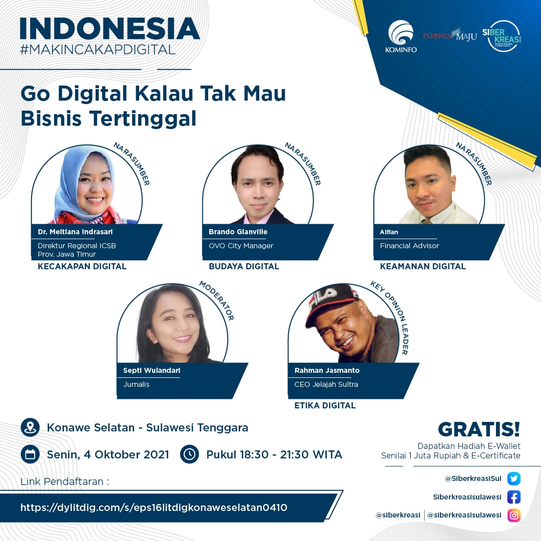 Koma.co.id, Konawe Selatan– Rangkaian Program Literasi Digital “Indonesia Makin Cakap Digital” di Sulawesi, yang diselenggarakan oleh Kementerian Komunikasi dan Informatika Republik Indonesia dan Siberkreasi bersama Dyandra Promosindo, dilaksanakan secara virtual pada 4 Oktober 2021 di Kabupaten Konawe Selatan, Sulawesi Tenggara. Kolaborasi ketiga lembaga ini dikhususkan pada penyelenggaraan Program Literasi Digital di wilayah Sulawesi. Kegiatan dengan tema “Go Digital Kalau Tak Mau Bisnis Tertinggal” ini diikuti oleh 634 peserta dari berbagai kalangan.