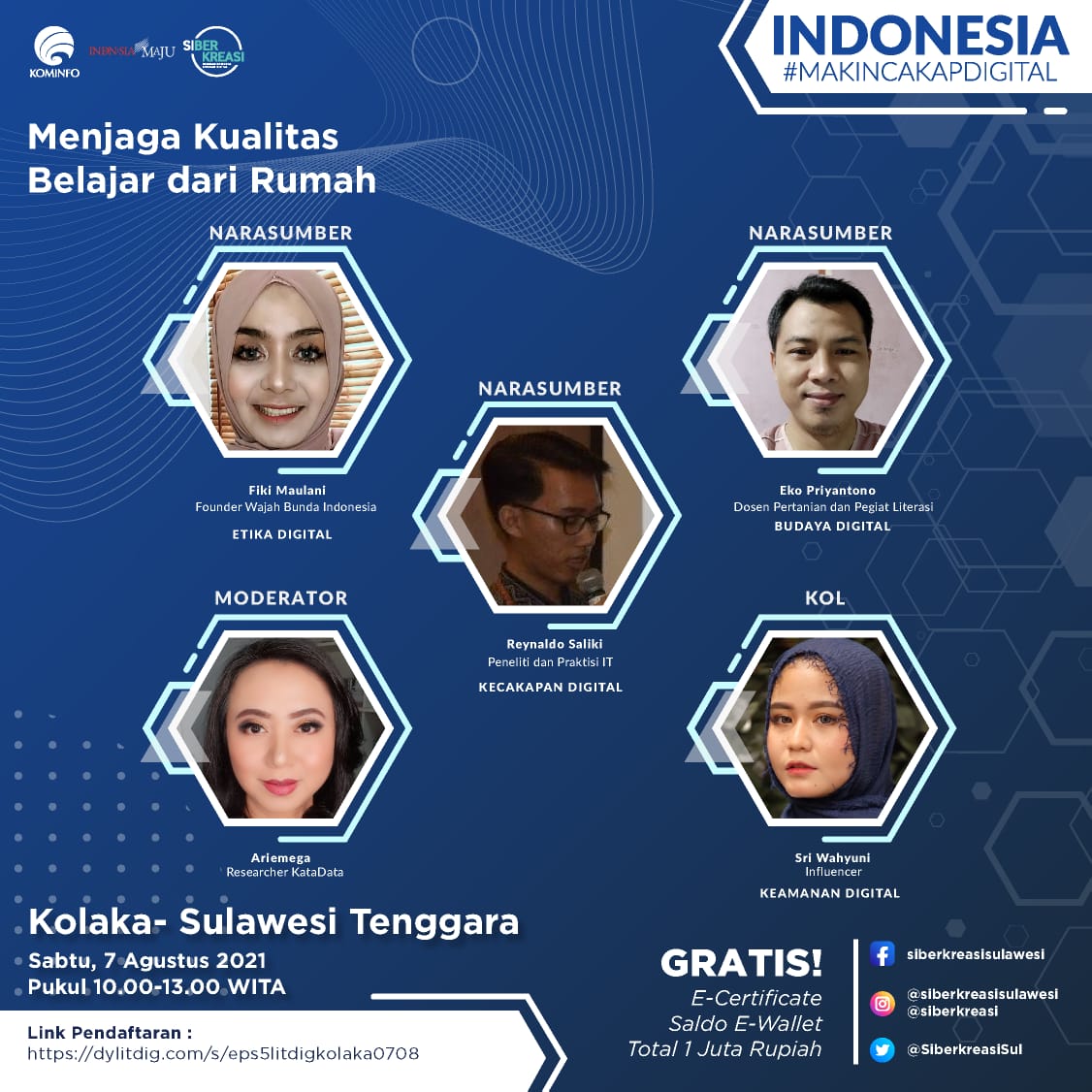 Empat orang narasumber yang tampil dalam seminar ini, yaitu Founder Wajah Bunda Indonesia, Fiki Maulani; peneliti dan praktisi IT, Reynaldo Salaki; dosen pertanian dan pegiat literasi, Eko Priyantono; serta pemengaruh, Sri Wahyuni. Sedangkan moderator yaitu Arie Mega dari KataData. Kegiatan webinar kali ini dihadiri oleh 647 peserta dari berbagai kalangan. Rangkaian Program Literasi Digital “Indonesia Makin Cakap Digital” di Sulawesi menargetkan peserta sebanyak 57.550 orang.