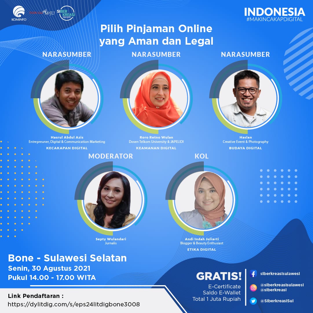 Koma.co.id, Bone– Rangkaian Program Literasi Digital “Indonesia Makin Cakap Digital” di Sulawesi, yang diselenggarakan oleh Kementerian Komunikasi dan Informatika Republik Indonesia dan Siberkreasi bersama Dyandra Promosindo kembali dilaksanakan secara virtual di Bone, Sulawesi Selatan pada 30 Agustus 2021. Kolaborasi ketiga lembaga ini dikhususkan pada penyelenggaraan Program Literasi Digital di wilayah Sulawesi. Adapun tema kali ini adalah “Pilih Pinjaman Online yang Aman dan Legal”.