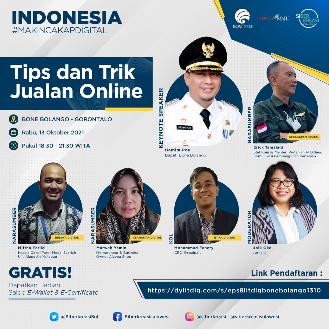 Koma.co.id, Bone Bolango– Sebanyak 1.823 peserta mendaftarkan dirinya untuk mengikuti Rangkaian Program Literasi Digital “Indonesia Makin Cakap Digital” di Sulawesi, yang diselenggarakan oleh Kementerian Komunikasi dan Informatika Republik Indonesia dan Siberkreasi bersama Dyandra Promosindo, yang dilaksanakan secara virtual pada 13 Oktober 2021 di Bone Bolango, Gorontalo. Kolaborasi ketiga lembaga ini dikhususkan pada penyelenggaraan Program Literasi Digital di wilayah Sulawesi. Adapun tema kali ini adalah “Tips dan Trik Jualan Online”.