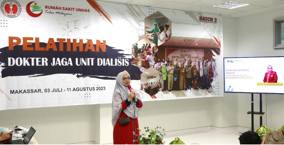 Sekretaris PERNEFRI Korwil Sulsel-Sulteng-Sultra-Kaltim-Papua-Papua Barat-Ambon, Prof. Dr. dr. Haerani Rasyid, M.Kes, Sp.PD, K-GH dalam sambutannya mengatakan bahwa, ”Pelatihan Dokter Jaga Unit Dialisis merupakan pelatihan yang bertujuan menghasilkan dokter pelaksana di Unit Dialisis yang kompeten untuk melakukan pengawasan dan tatalaksana kegawatdaruratan pada pasien-pasien yang menjalani hemodialisis yang berada di bawah pengawasan dan koordinasi Dokter Penanggungjawab pelayanan dialisis dalam hal ini dokter spesialis penyakit dalam konsultan ginjal hipertensi (SpPD-KGH) dan atau Spesialis Penyakit Dalam dengan kompetensi tambahan dialisis,”.