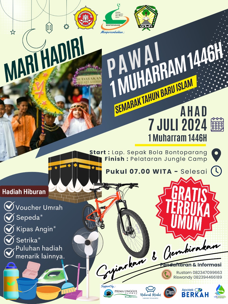 Pawai 1 Muharram akan dilaksanakan pada Ahad, 7 Juli 2024. Titik start di Lapangan Sepak Bola Campagana Bontoparang kemudian Finish di Pelataran Jungle Camp, salah satu destinasi wisata favorit dan instagramable di Kabupaten Gowa.