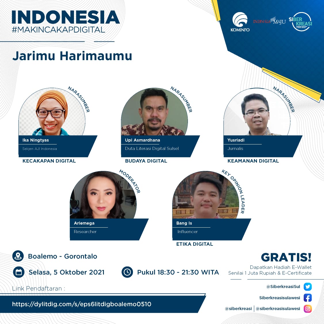 Koma.co.id, Boalemo– Rangkaian Program Literasi Digital “Indonesia Makin Cakap Digital” di Sulawesi, yang diselenggarakan oleh Kementerian Komunikasi dan Informatika Republik Indonesia dan Siberkreasi bersama Dyandra Promosindo, dilaksanakan secara virtual pada 5 Oktober 2021 di Boalemo, Gorontalo. Kolaborasi ketiga lembaga ini dikhususkan pada penyelenggaraan Program Literasi Digital di wilayah Sulawesi. Adapun tema saat ini adalah “Jarimu Harimaumu”.