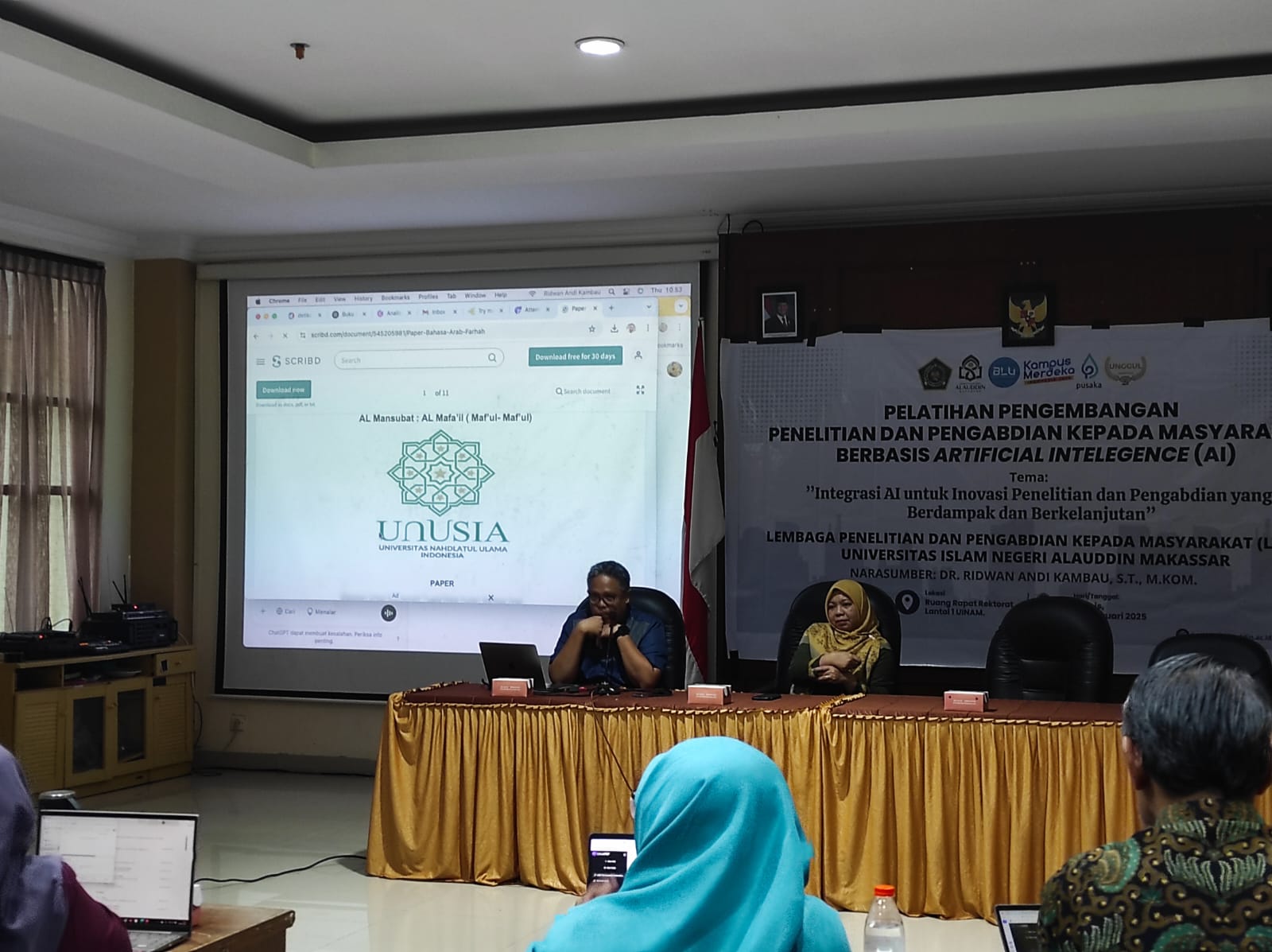 Pelatihan ini diadakan di Ruang Rapat Rektorat, Lantai 1 UINAM, dan dihadiri sekitar 30 dosenUIN Alauddin Makassar yang memiliki minat dalam pemanfaatan AI di bidang penelitian dan pengabdian kepada masyarakat. Para peserta tampak antusias mengikuti sesi diskusi dan praktik langsung dalam penerapan teknologi AI.