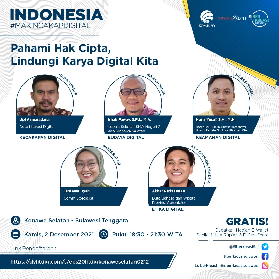 Koma.co.id, Konawe Selatan– Rangkaian Program Literasi Digital “Indonesia Makin Cakap Digital” di Sulawesi, yang diselenggarakan oleh Kementerian Komunikasi dan Informatika Republik Indonesia dan Siberkreasi bersama Dyandra Promosindo, kembali dilaksanakan secara virtual di Konawe Selatan, Sulawesi Tenggara, 2 Desember 2021.